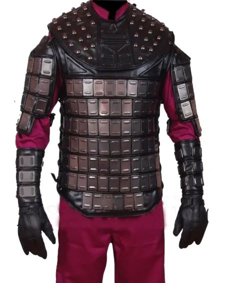The General Ursus costume from Planet of the Apes is crafted with premium Grade A real leather and double stitching for durability. Small metal plates, glyphs on the chest, and shoulder pads with strings attached make up this gorilla costume. The inside lining of the gorilla costume is made of polyester and satin. We take great care in our items. The Burgundy color trouser and round neck less zipper opening shirt make its adorable look. This Urus costume is great collection for Halloween or Christmas Eve. The costume upper body have lace up closure.