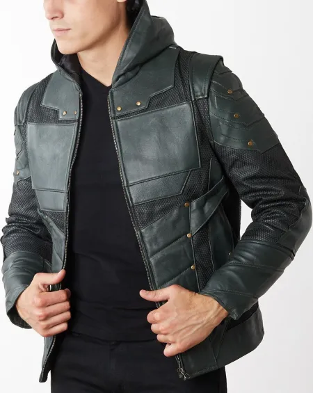 Check out this hooded forest green leather jacket for guys, created from genuine leather. It has a green leather hood, an inner pocket, and a viscose lining for optimal comfort and durability.