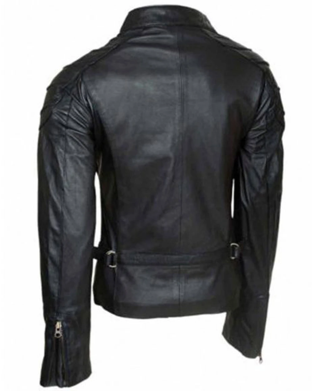 The Angelina Jolie Wanted Fox Leather Jacket is made from real leather. The stunning jacket is offered in a seductive black hue. The jacket includes a stand-up collar with a snap stab and an asymmetrical YKK zipper for closing at the front. The inside lining of the Wanted Fox Jacket is soft viscose for extra warmth and comfort. The shoulders feature a sophisticated design that appeals to the superstar's followers. The jacket has long sleeves and zipper cuffs and is a thin fitting. A flap tab diagonal pocket is located at the waist of the premium outfit. It's Angelina Jolie's most sought-after look.