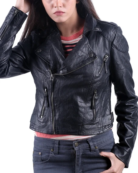 Winters must-have outfit for stylish girls is black biker jacket. Crafted from high graded real lamb leather to achieve the original texture of skin. The black color makes distinguishing appearance with anything you pair it with. It is a precious and elegant piece to elevate the grace in your regular posture.
